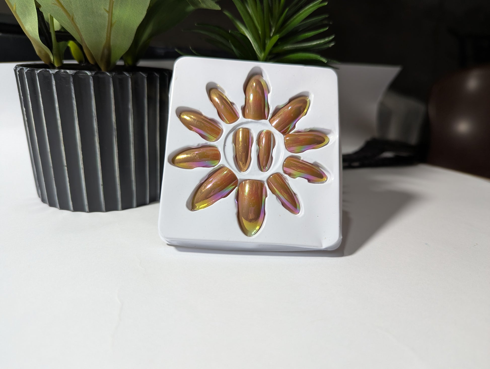 This kit features 10 beautiful, reusable fake nails with an incredible color-shifting finish. Depending on the light, you'll see a mesmerizing golden chrome base with flashes of pink, green, and fiery orange, creating a true "Aurora Effect" or Holographic look.